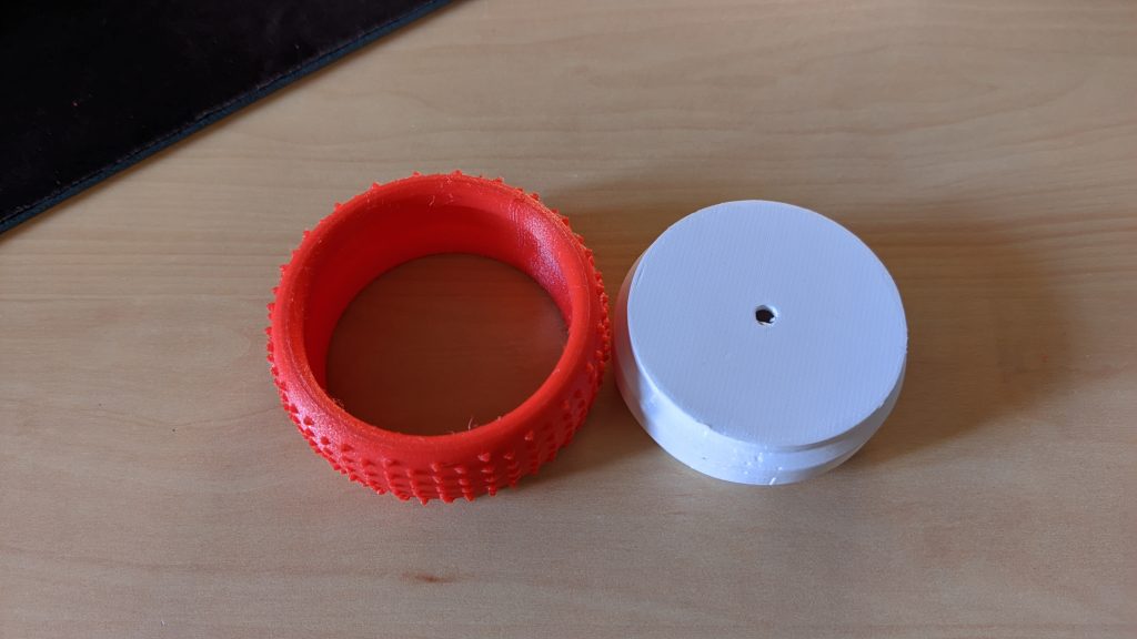 Je ne pouvais pas garder le modèle d’origine car celui-ci nécessitait des supports pour le pneu, or je ne peux pas en mettre pour le filament souple. Il me fallait aussi un design qui pourrait maintenir le pneu en position centrée.