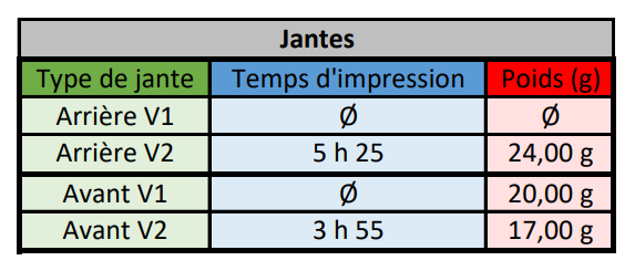 Quant au prix, pour faire les 4 jantes (2 avants et 2 arrières) il faut compter 1.99€ de filament, pour 18h40 d’impression. Et pour les 4 pneus il faut compter environ 7,83€. Ce qui me fait un coût total de 9,82€ contre environ 40€ dans le commerce.