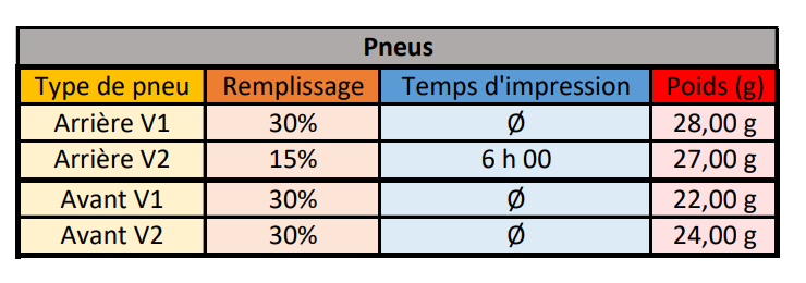 Le résultat obtenu était exactement celui recherché pour la roue avant qui n’a pas une grande surface en contact avec la route et nécessite donc une souplesse différente de celle de la roue arrière. La surface de contact étant différentes à l’avant et à l’arrière, avec les mêmes réglages d’impression, le résultat à l’arrière différait (pneu un peu plus mou). Pour être plus clair, comme la roue avant est moins large cela rend le filament flexible plus rigide qu’une roue arrière qui est plus large et permet plus de souplesse pour le pneu.
